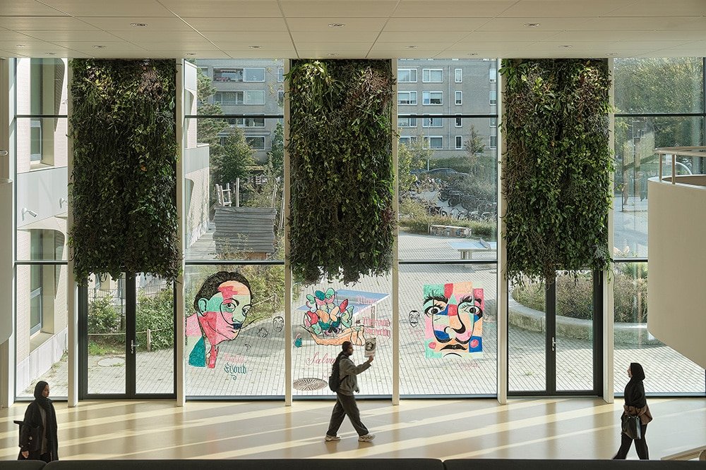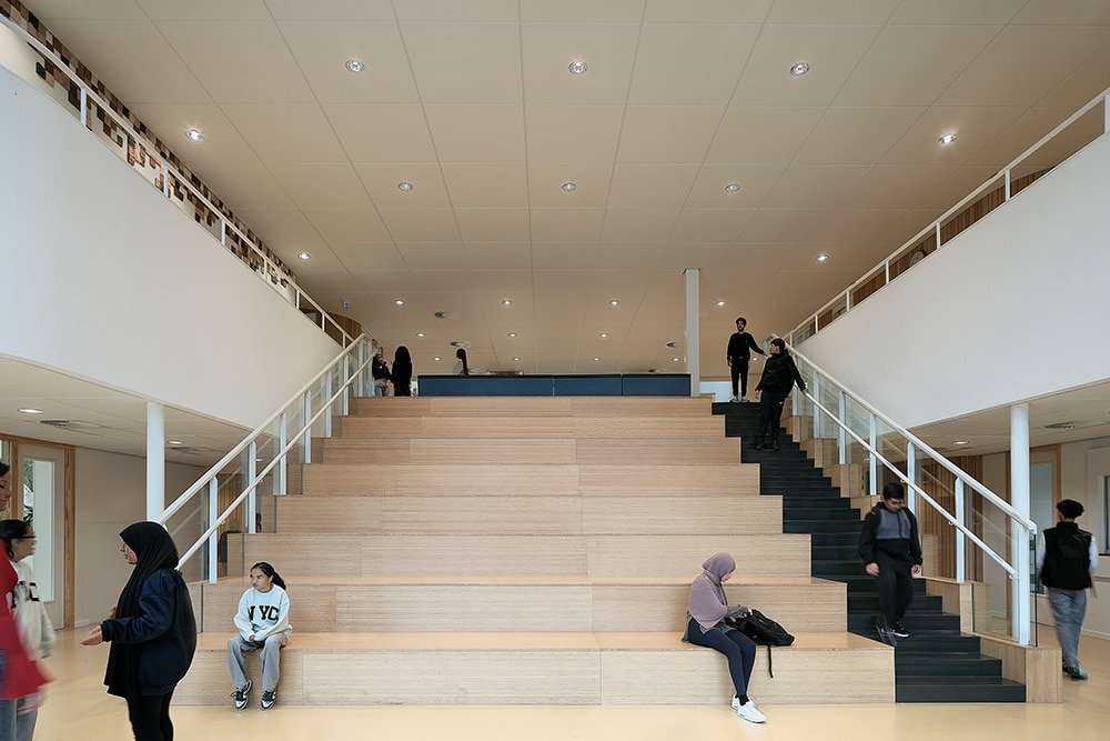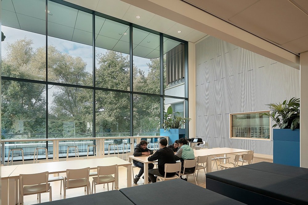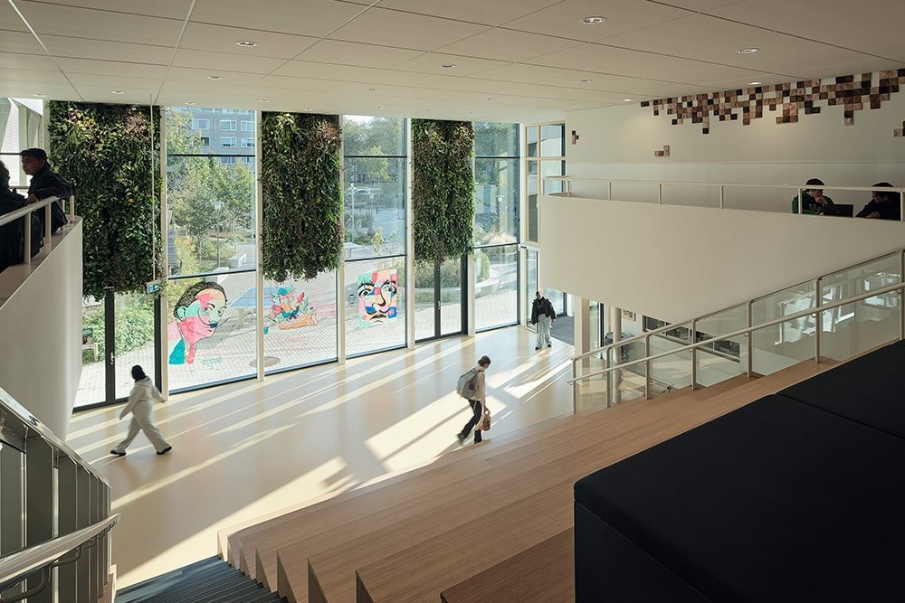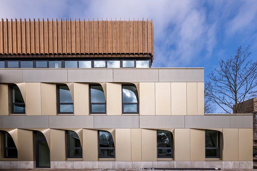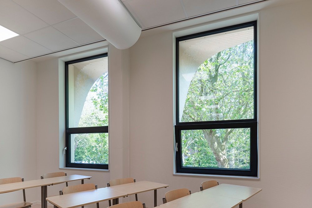 Een compact gebouw met minder volume betekent een lager energieverbruik en minder materiaalgebruik. Bovendien is de school demontabel uitgevoerd en Energie Neutraal. Naast een goed isolerende schil hebben we de gevelopeningen parametrisch geoptimaliseerd met 10% waardoor opwarming en warmteverlies beperkt wordt. Hierdoor konden we 15% besparen op het vermogen van de koelinstallatie en daarmee het energieverbruik. Ook de ‘wimpers’ aan de gevel dragen hieraan bij. Dankzij de wimpers heeft het gebouw geen screens nodig waardoor er vanuit de leslokalen altijd uitzicht is op de groene omgeving.