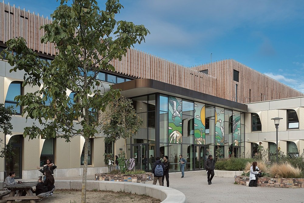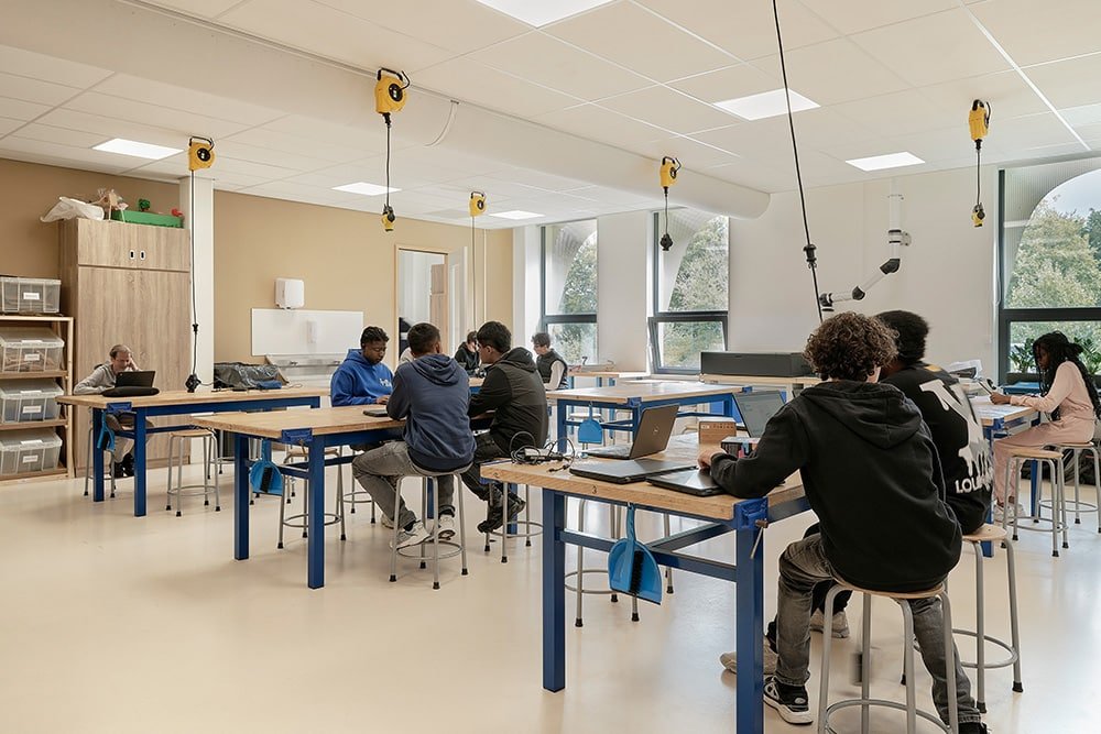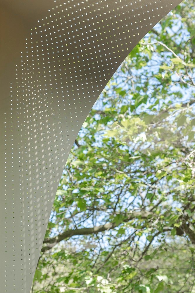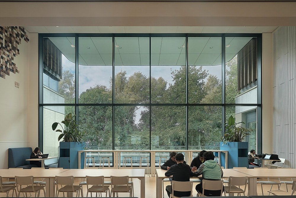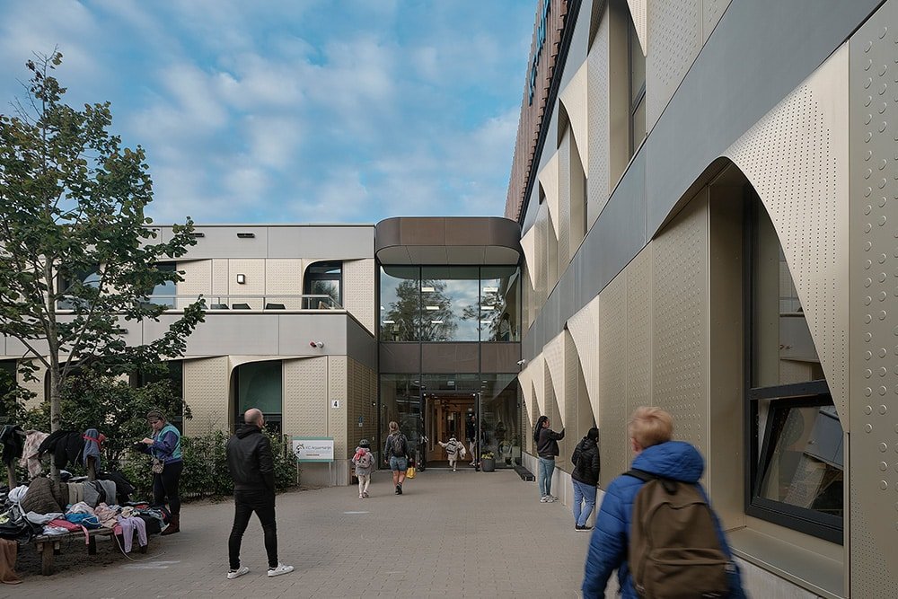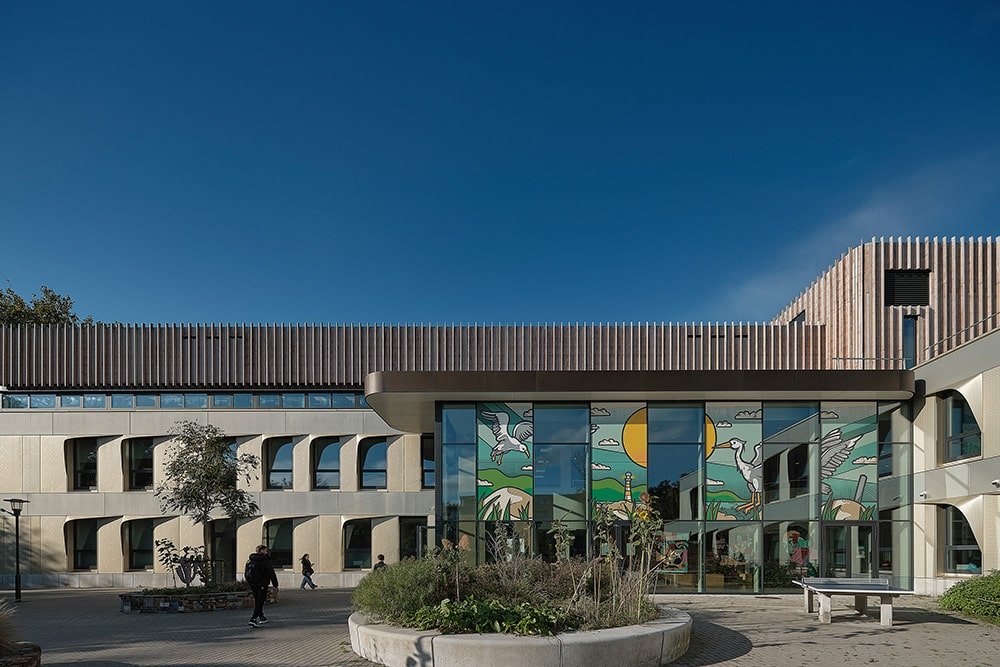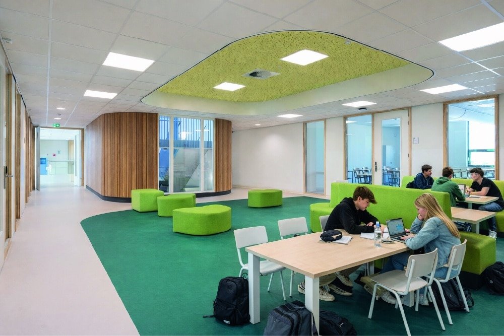 Een compact gebouw met minder volume betekent een lager energieverbruik en minder materiaalgebruik. Bovendien is de school demontabel uitgevoerd en Energie Neutraal. Naast een goed isolerende schil hebben we de gevelopeningen parametrisch geoptimaliseerd met 10% waardoor opwarming en warmteverlies beperkt wordt. Hierdoor konden we 15% besparen op het vermogen van de koelinstallatie en daarmee het energieverbruik. Ook de ‘wimpers’ aan de gevel dragen hieraan bij. Dankzij de wimpers heeft het gebouw geen screens nodig waardoor er vanuit de leslokalen altijd uitzicht is op de groene omgeving.