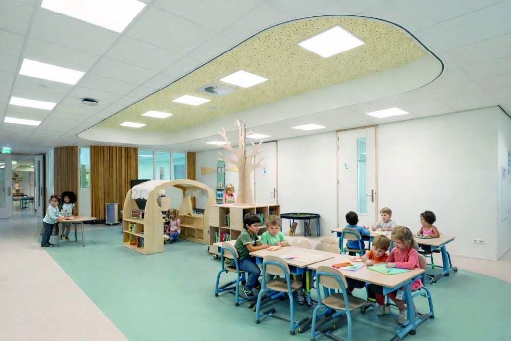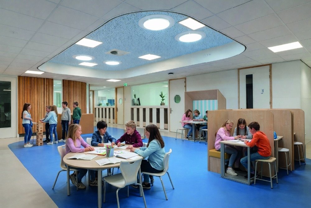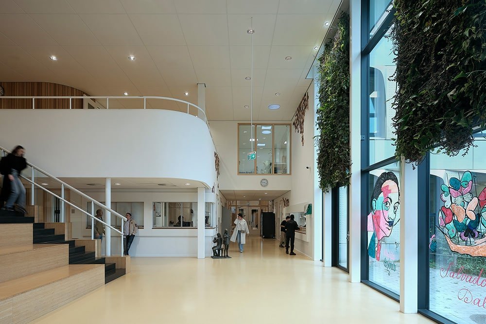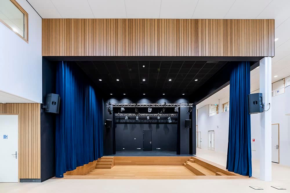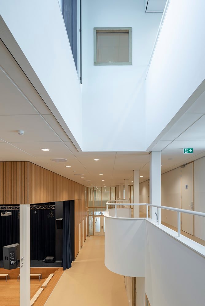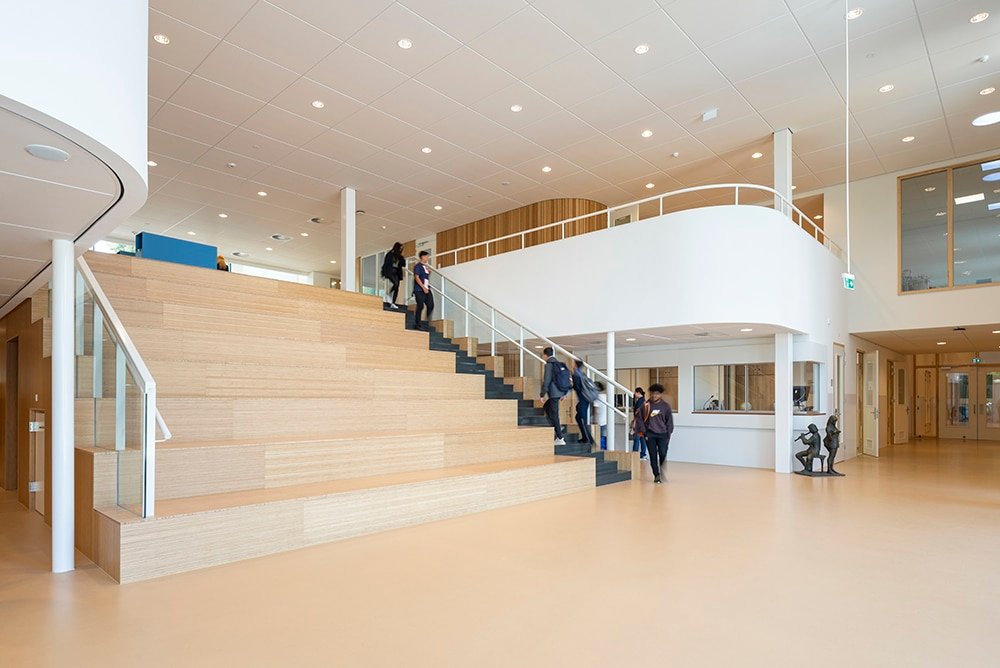 De binnenruimtes zijn afgewerkt met hout en lichtgekleurde wanden en meubels. Het kleurgebruik in het gebouw is door onze interieurarchitect afgestemd op de wensen en behoeften van de kinderen van het Speciaal Onderwijs. Het kleurenpalet is in overleg doorgevoerd in het gehele gebouw, zodat er een inclusief gebouw is ontstaan. Iedereen hoort erbij!