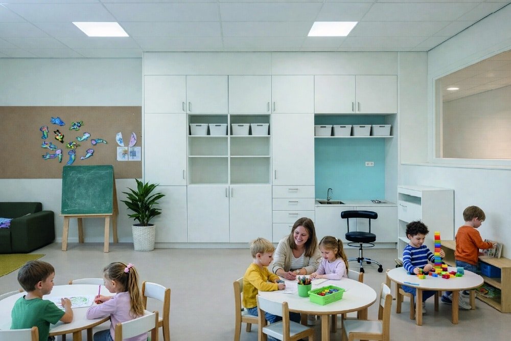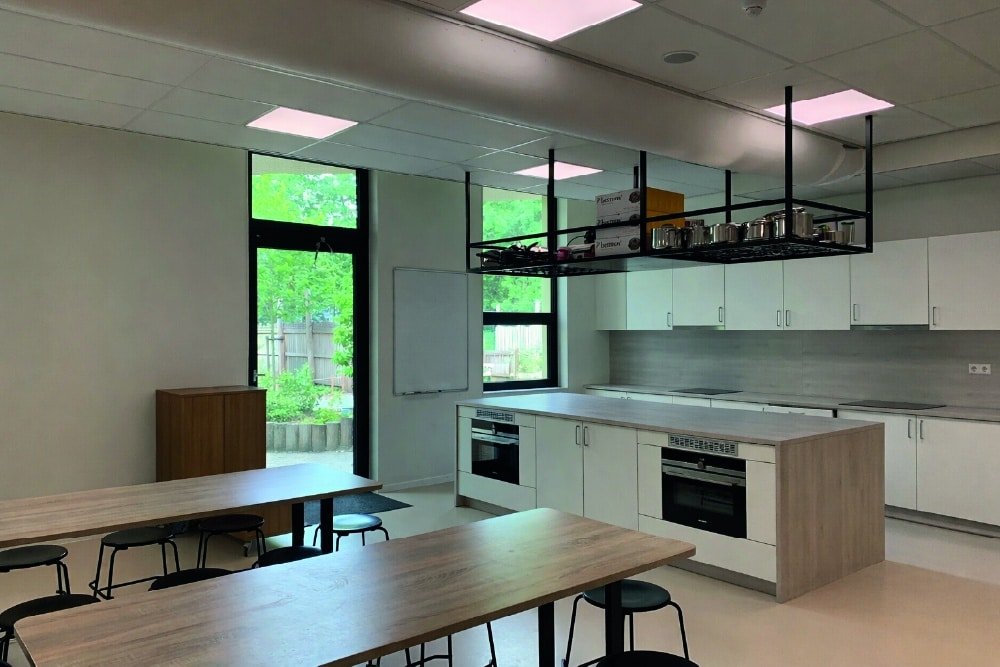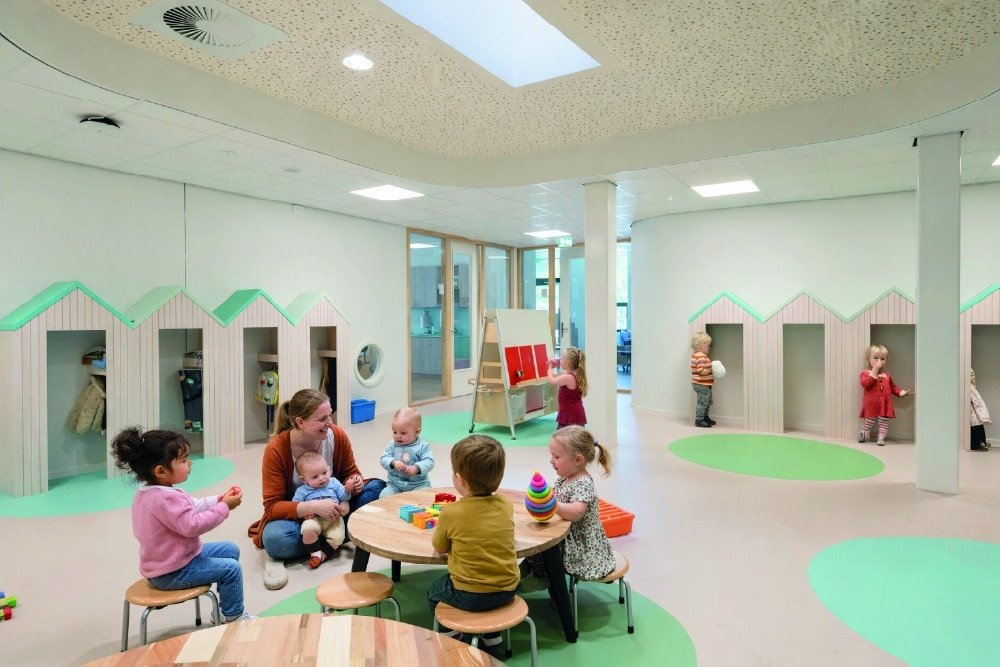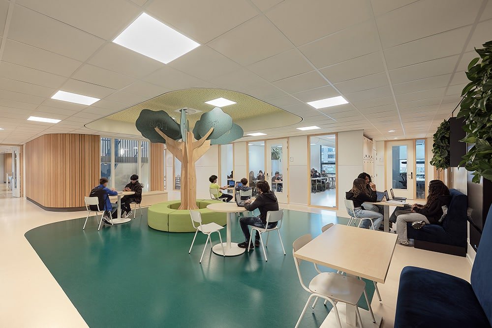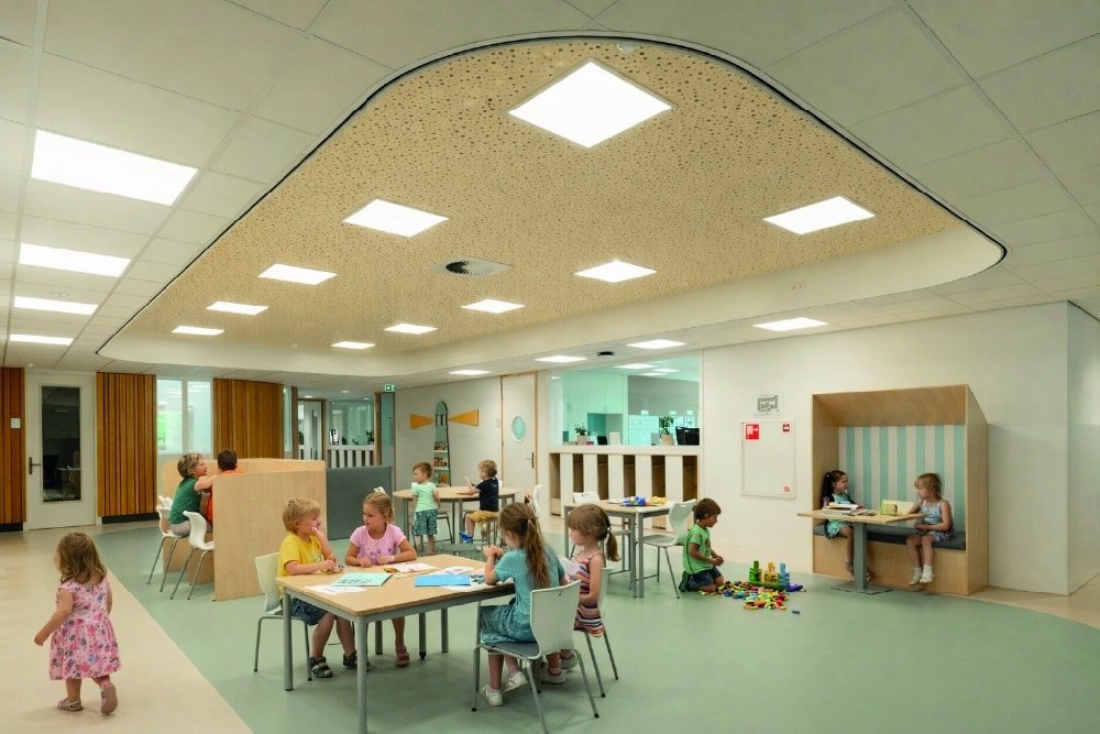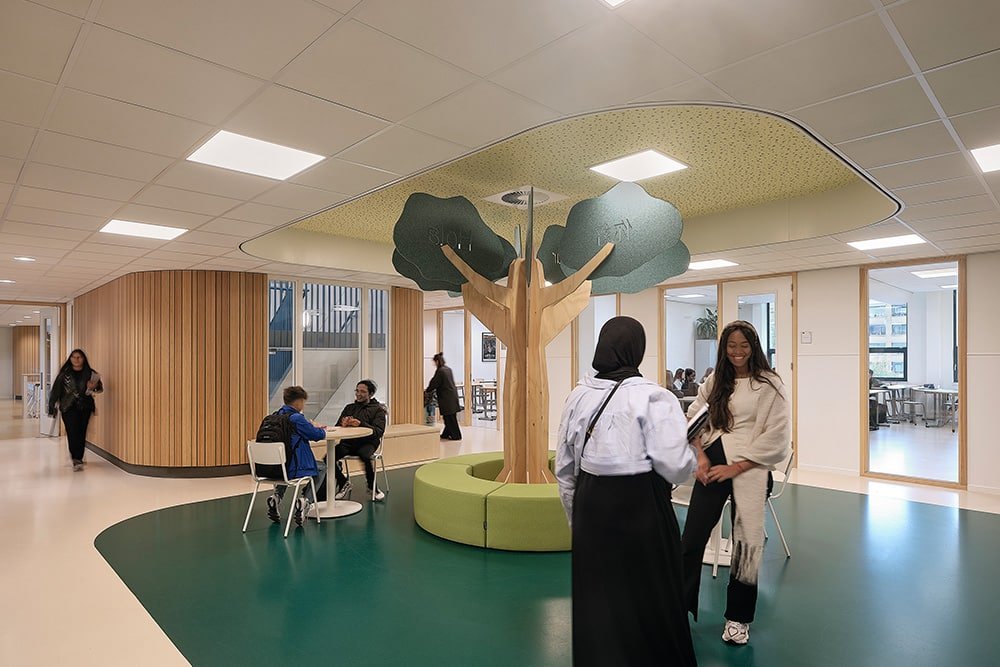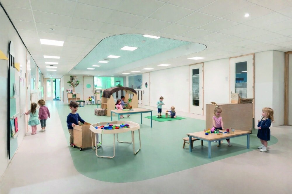 De binnenruimtes zijn afgewerkt met hout en lichtgekleurde wanden en meubels. Het kleurgebruik in het gebouw is door onze interieurarchitect afgestemd op de wensen en behoeften van de kinderen van het Speciaal Onderwijs. Het kleurenpalet is in overleg doorgevoerd in het gehele gebouw, zodat er een inclusief gebouw is ontstaan. Iedereen hoort erbij!