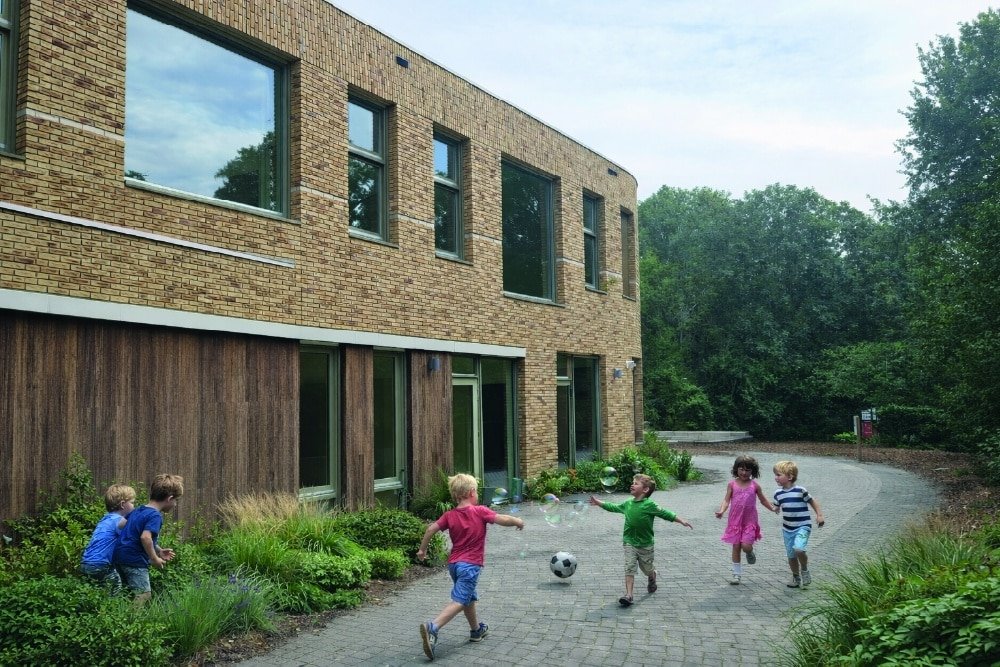 Het Kindcentrum is ontworpen als ‘paviljoen in het groen’, grenzend aan een park van ca. 12.500 m2. Door de compacte footprint van het gebouw blijft er nóg meer ruimte over voor groen rondom het gebouw. De vriendelijke vorm van de school definieert verschillende plekken rondom waardoor op alle oriëntaties de aansluiting op het park wordt gemaakt. Het gebouw en schoolplein zijn natuurinclusief en klimaatadaptief ontworpen. Het schoolplein is buiten schooltijden toegankelijk voor de buurt, net als het park. Samen vormen zij één geheel.