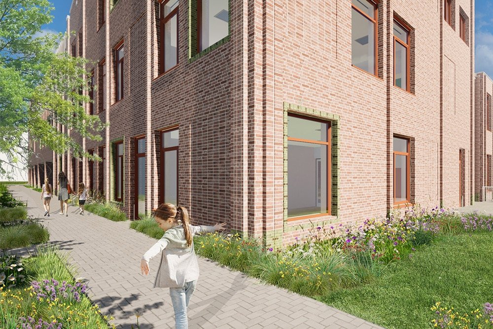 Het schoolplein sluit naadloos aan op de groenzone en vormt er één geheel mee. Klimaatadaptatie en natuurinclusief bouwen stonden centraal in het ontwerp: inheemse plant- en boomsoorten zorgen ervoor dat het plein zich vanzelfsprekend voegt in zijn groene omgeving. Gevelgroen en een daklandschap met waterberging en beplanting maken de natuur tot een integraal onderdeel van het gebouw.