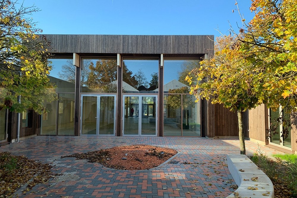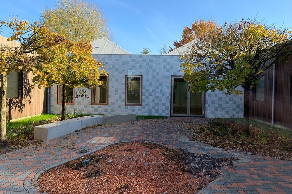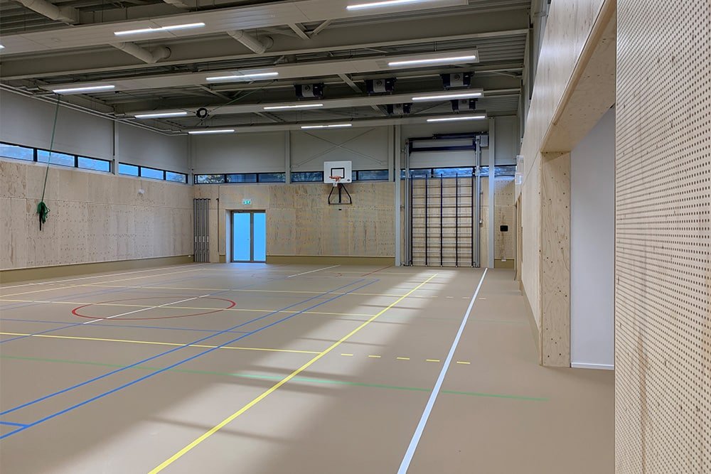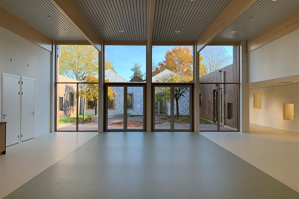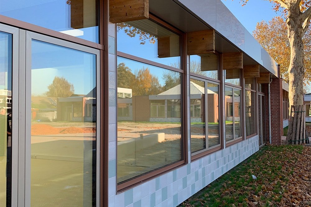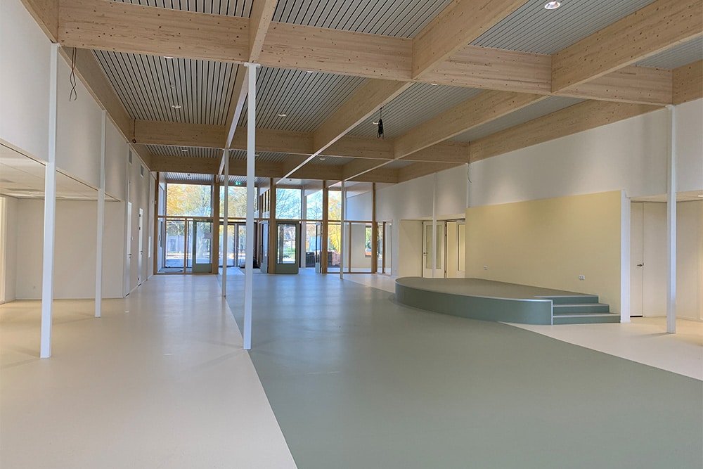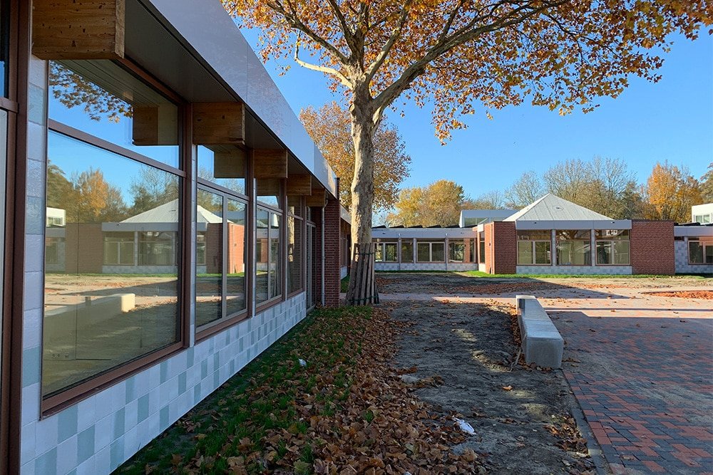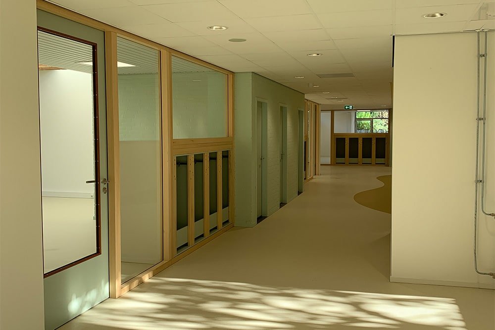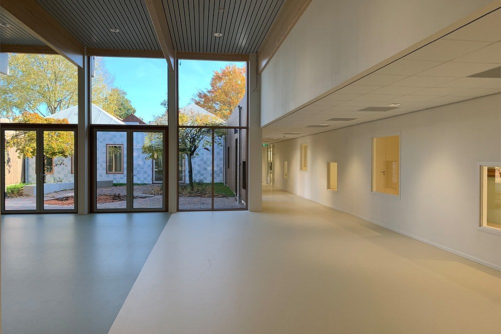 We maakten van de bestaande materialen een kans in plaats van een beperking. We hebben de hoofddraagconstructie in zijn geheel hergebruikt en bewust in het zicht gelaten. Binnenkozijnen, gymtoestellen en toiletten zijn geoogst, gereinigd en teruggeplaatst. De locatie van het oude schoolhart lag al op de goede plek echter voldeed deze ruimtelijk niet meer in de beschikbare hoogte. De nieuwe constructie van het centrale hart is zodanig ontworpen dat deze naadloos aansluit op de bestaande structuur, zonder dat er verzwaring van de bestaande fundering benodigd was. Voor een deel van de gevelafwerking hebben we zelfs gebruik gemaakt van een restpartij geveltegelwerk van een woontoren in Groningen. Het oppervlak van de te betegelen geveldelen is speciaal aangepast aan de hoeveelheid van de restpartij en is losmaakbaar op een aparte plaat houtskeletbouw bevestigd. De overige gevelbekleding bestaat uit biobased bamboe latten.